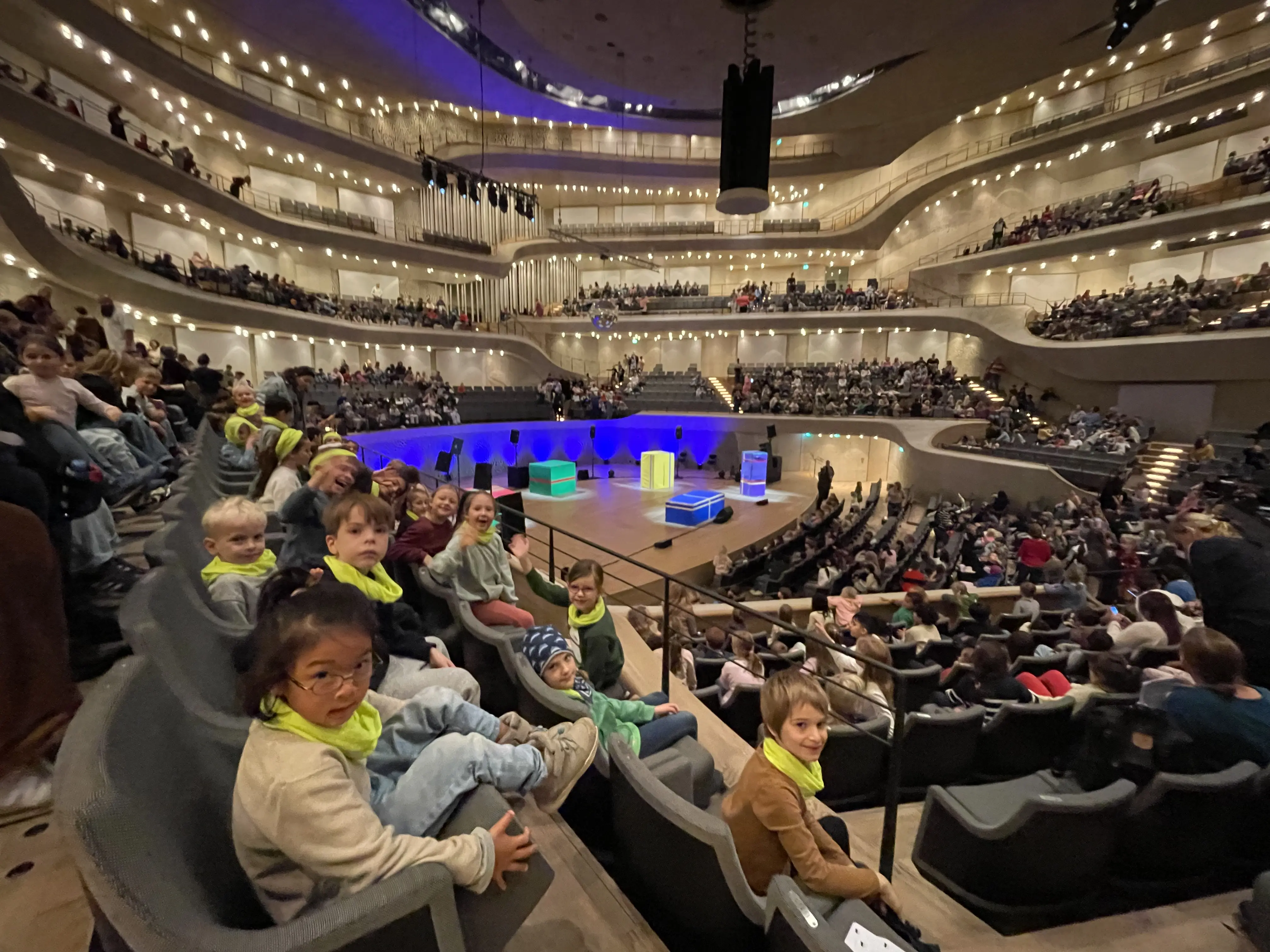 Der erste Ausflug der Klasse 1b war gleich ein besonderes Ereignis. Es ging in die Elbphilharmonie zu einem Funkelkonzert “Fünf gewinnt” im großen Saal. Neben dem großen Saal war auch schon die Rolltreppe zur Plaza ein besonderes Erlebnis für die Kinder, die manche noch nie ausprobiert hatten. Im Konzertsaal durften die Kinder 2 Violine, einem Arkodeon und eienm Kontrabass lauschen, die immer wieder ohne Stimmen - nur mit Tönen - versucht haben miteinander zu musizieren. Nachdem die vier sich geeinigt haben, kam die Nummer 5 (der Tanz) dazu und erst dann war es vollkommen. Ein tolles Hör- und Klassenerlebnis für die Erdmännchen.