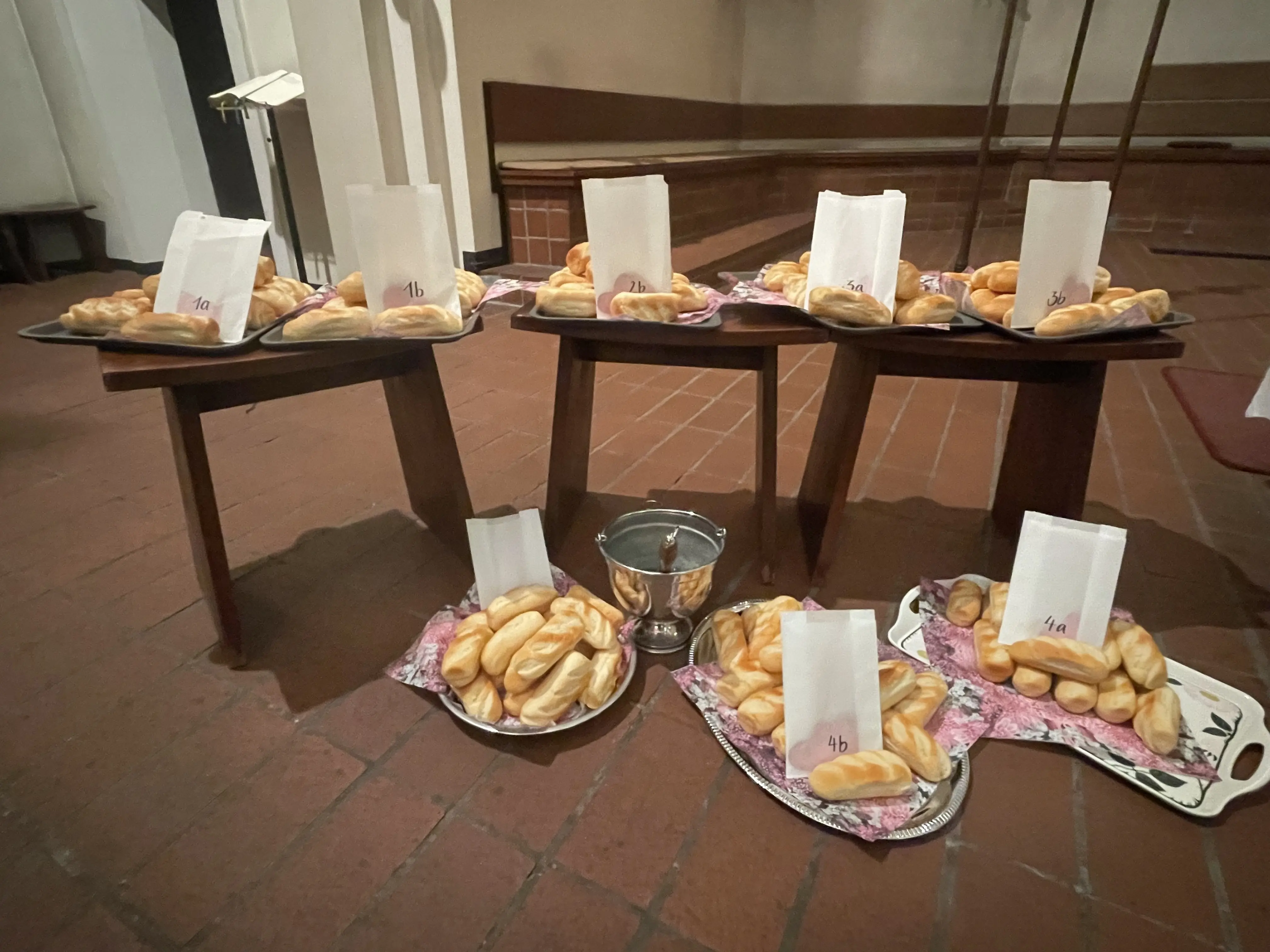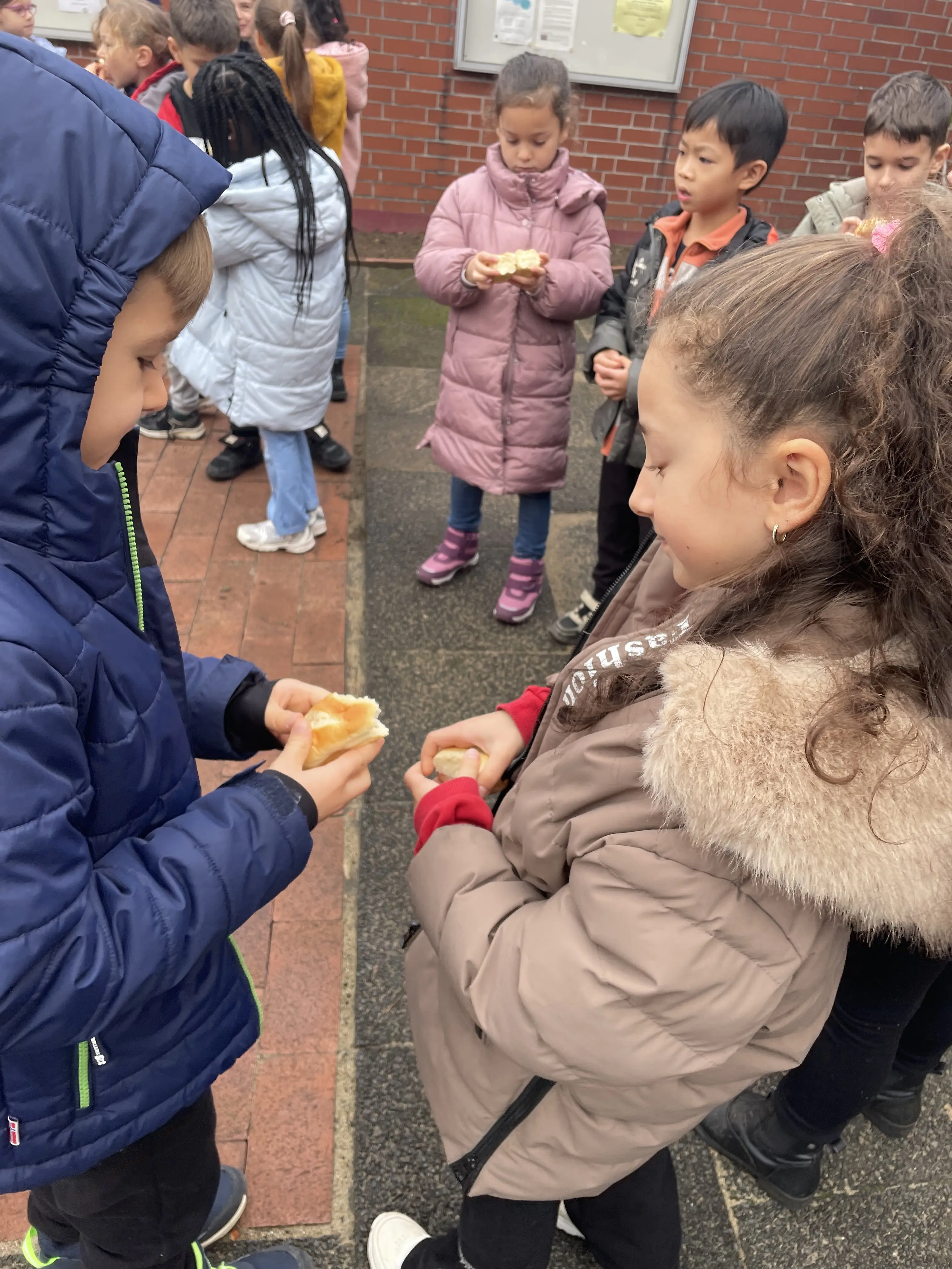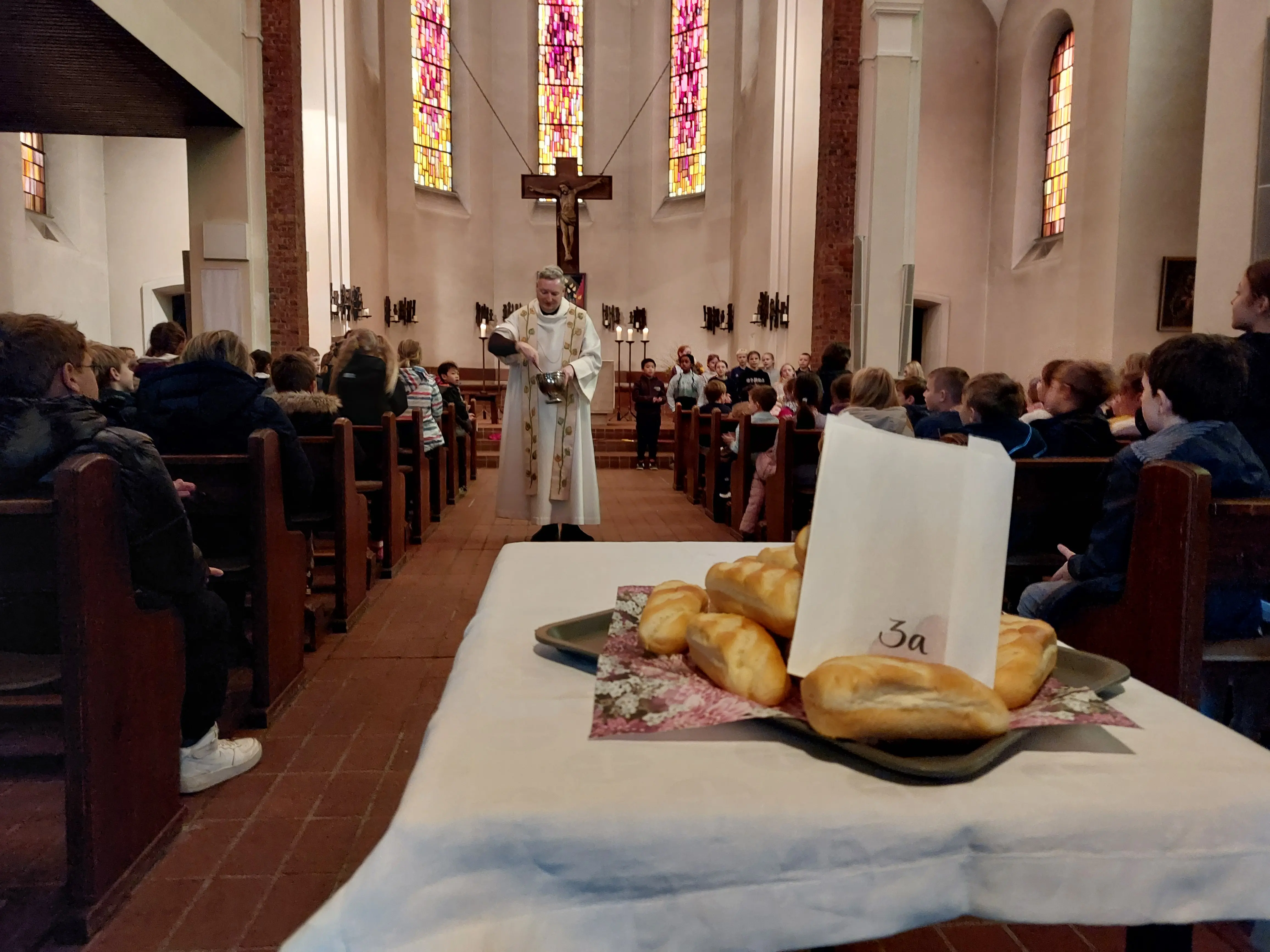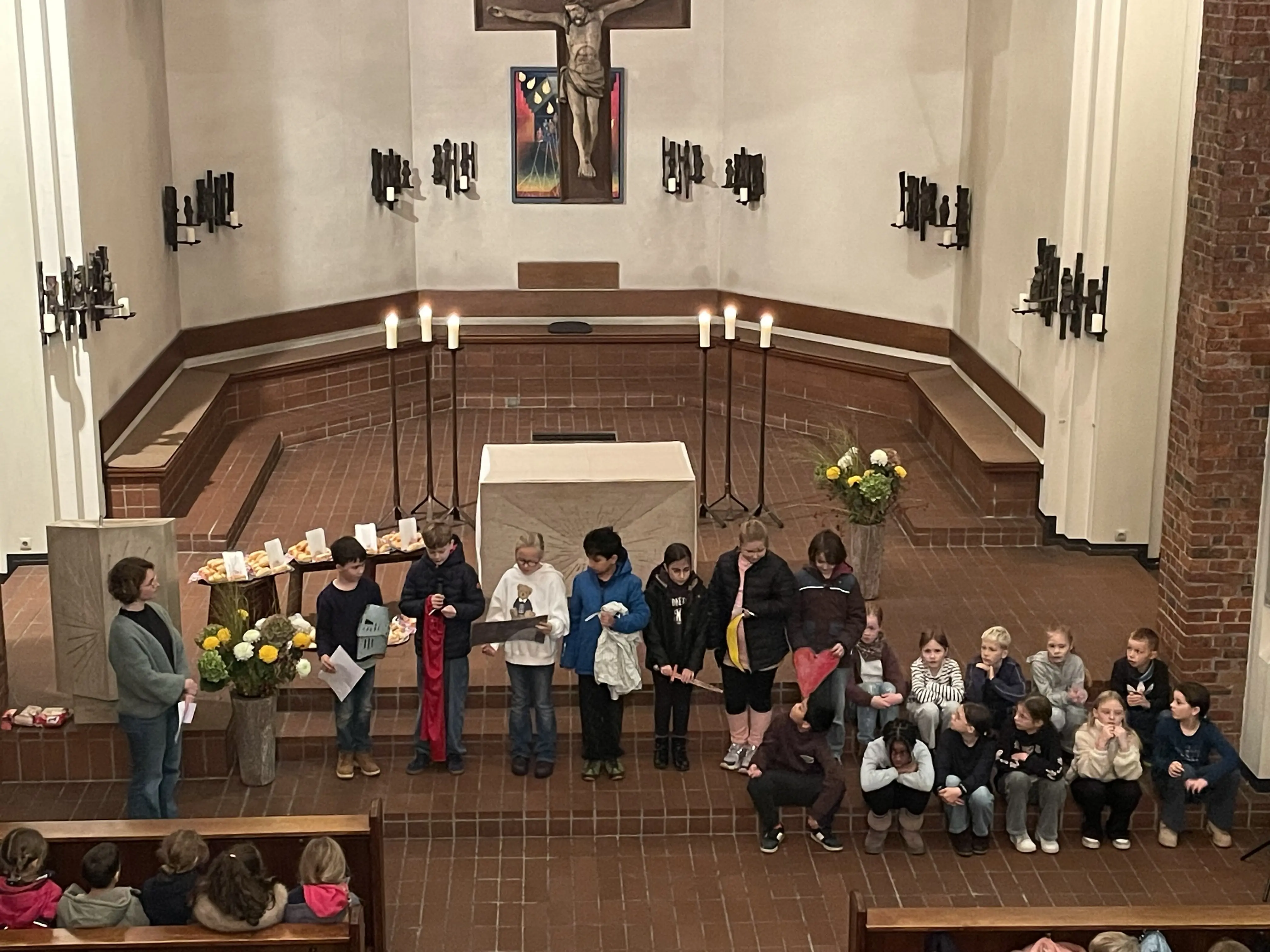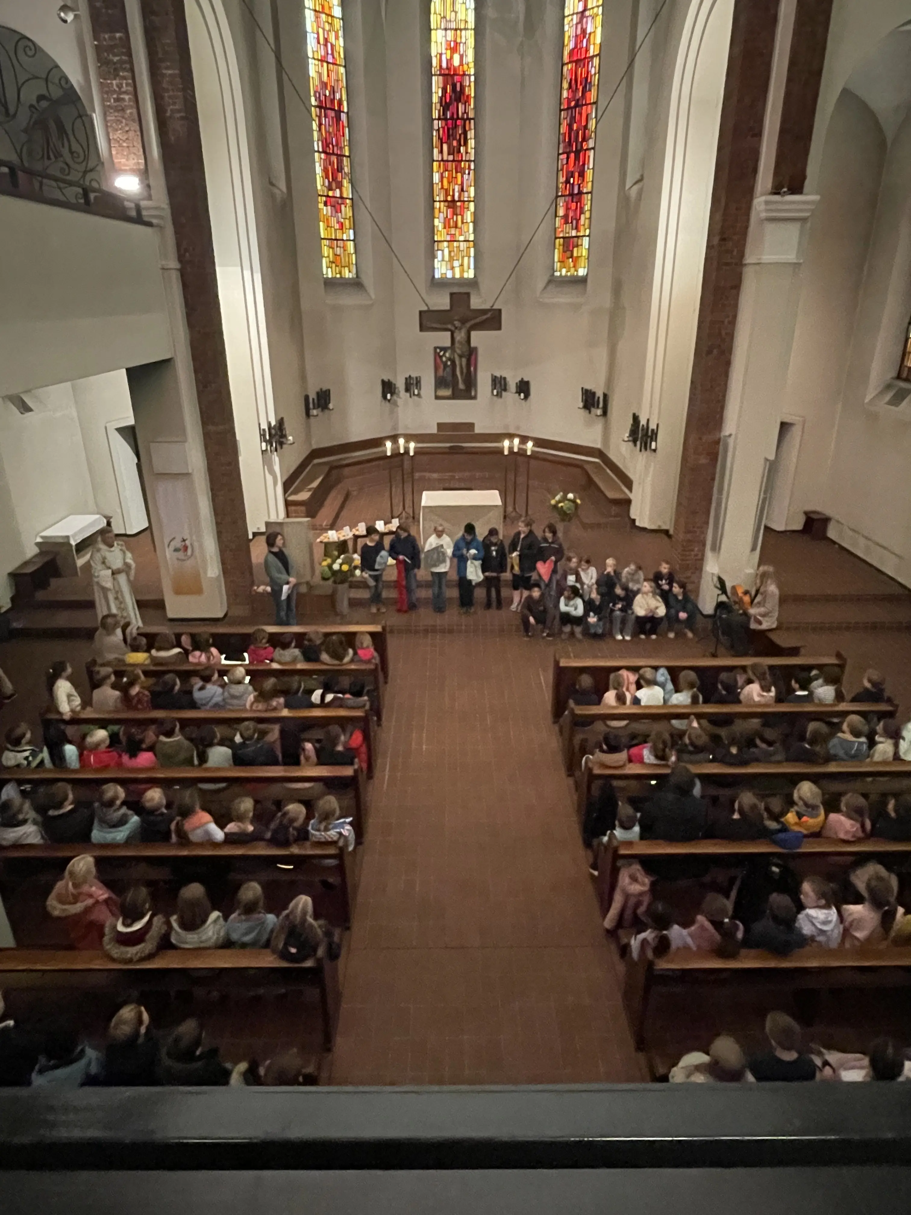 Traditionell haben wir dieses Jahr wieder das Fest des heiligen Martin in vielen Momenten gefeiert. Morgens haben wir alle zusammen im Gottesdienst uns an die Geschichte vom heiligen Martin erinnert und am Ende gemeinsam das Brot geteilt. Jede Schuülerin und jeder Schüler hat ein kleines Herz mitgenommen - als Erinnerung auch anderen Menschen das Leben warm und hell zu machen - so wie Martin auch. Das Teilen erfahren die Kinder aus dem Jahrgang 2 besonders. Sie sammeln in dieser Woche für Claras Suppenküche haltbare Lebensmittel.
